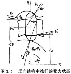 在傳動(dòng)圈與激波器轉(zhuǎn)向相反的結(jié)構(gòu)中,工作推桿的受力狀誠如圖3.4所示。從受力狀態(tài)圖可以看出,在運(yùn)動(dòng)過程中,推桿與導(dǎo)槽必然形成雙側(cè)接觸。推桿兩側(cè)將造成嚴(yán)重磨損,實(shí)際生產(chǎn)中,應(yīng)避免使用反向結(jié)構(gòu)。