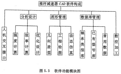 軟件主要由分析設(shè)計(jì)、圖形管理、數(shù)據(jù)庫管理及摟控加工四大部分組成,并提供了一個(gè)友好的人機(jī)交互接口界面用于實(shí)現(xiàn)漢字人機(jī)對(duì)話。本交互接口由三級(jí)推拉彈出式菜單組成。軟件模塊結(jié)構(gòu)如圖5.3所示。各大模塊的主要功能及特點(diǎn)如下: