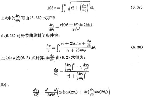 從以上設(shè)計過程可以看出,根據(jù)非圓太陽輪設(shè)計行星輪為圓的純滾動非圓行經(jīng)齒輪傳動機(jī)構(gòu)時,并不是對任意指定的太陽輪節(jié)曲線都有解。當(dāng)太陽輪節(jié)曲線的周期數(shù)n1給定后,節(jié)曲線必須有兩個可調(diào)整的參數(shù)(例中的a和b)的要由節(jié)曲線的封閉條件及輪齒等分條件來確定。齒輪模數(shù)m和太陽輪齒數(shù)z1是被預(yù)先指定了的。當(dāng)各參數(shù)求出后,要用不干涉條件(6.28)式進(jìn)行校驗,若發(fā)生干涉,應(yīng)調(diào)整z1數(shù)值,重新計算太陽輪的可調(diào)整參數(shù)。