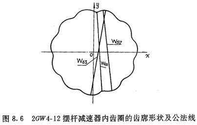 將2GW4-12擺桿減速器的設(shè)計參數(shù)代入公法線條件式(7.79)中,并給外滾子半徑Tz以增量0.18mm代入,可得到三條不同長度的公法線,如圖8.6所示。