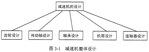 減速機(jī),作為一個(gè)完整的傳動(dòng)系統(tǒng),其設(shè)計(jì)包括:齒輪設(shè)計(jì),傳動(dòng)軸設(shè)計(jì),軸承設(shè)計(jì),機(jī)箱設(shè)計(jì)以及連軸器設(shè)計(jì),如圖3-1所示。