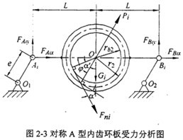 其次分析偏置型三環(huán)減速機的情況,圖2-17所示為偏置型三環(huán)減速機傳動結(jié)構(gòu)圖,偏置型三環(huán)減速機的一塊環(huán)板的結(jié)構(gòu)如圖2-18所示,它的受力情況和坐標系選取如圖2-19所示,符號的標定及含義同對稱型三環(huán)減速機。