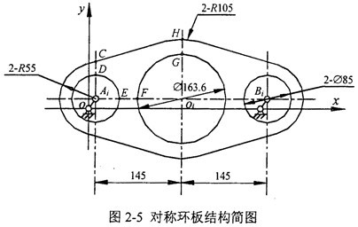 對稱B型三環(huán)減速機的一塊環(huán)板的結(jié)構(gòu)如圖2-13所示,它的受力情況和坐標系統(tǒng)取如圖2-14所示,符號的標定及含義同對稱A稱三環(huán)減速機。