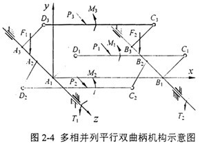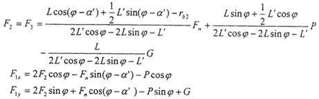 如果不計兩上支承軸重力的影響,則兩上支承軸O2B、O3C可看作二力桿,它的作用力如圖所示。不考慮制造誤差和載荷分配不均勻因素的影響,可以補充方程:F2=F3,則聯(lián)立求解得到: