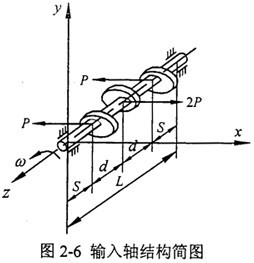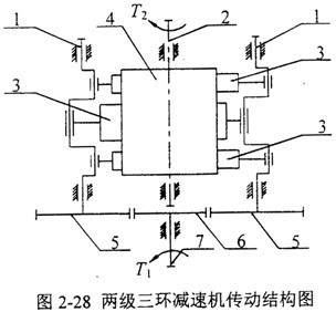 三環(huán)減速機箱體支承軸承周期性的作用力是箱體振動的激振力,是三環(huán)減速機振動的根源,因此對箱體支承軸承的作用力作深入的探討實屬必要。對于一級輸入袖8和二級輸出軸2來說,軸上作用有輪齒嚙合力、齒輪和軸的重力和兩個支承軸承的作用力。從理論上講,由于是雙輸入軸輸入,嚙合力沿嚙合線長度方向均勻分布,則嚙合力相互平衡,支承軸承只剩下齒輪和軸重力的作用,作用力的求解變得極其簡單。即使考慮載荷分配不均勻的影響,它們的支承軸承作用力的求解也相對容易。下面著重探討一下一級輸出二級輸入軸支承軸的作用力。