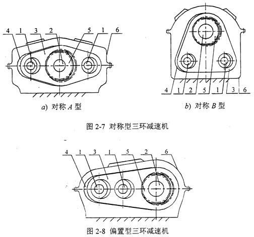 偏置型三環(huán)減速機的環(huán)板軸承所受載荷比對稱型三環(huán)減速機大很多,在設(shè)計和實際使用中應(yīng)盡量避免采用這種結(jié)構(gòu)布置形式。雖然對稱B型和偏置型三環(huán)減速機的受力性能不如對稱A型三環(huán)減速機,但是由于它們的兩個輸入軸比較接近,故而易于實現(xiàn)雙驅(qū)動。