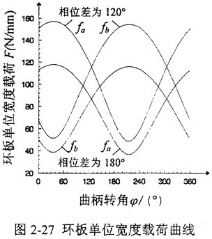 L1=145mm,L2=145mm,Z2=42,Z1=44,m=3.5mm,a=20°,a′=37.356°,T=875N·m,n=1440r/min,b1=b2=25mm。則環(huán)板左孔Ai單位寬度上的載荷fa、環(huán)板右孔Bi單位寬度上的載荷fb隨輸入曲柄轉(zhuǎn)角 變化的曲線如圖2-27所示。