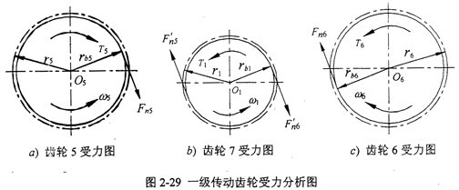 一級傳動齒輪受力分析如圖2-29所示,a)、b)、c)分別為分流齒輪5、主動齒輪7、分流齒輪6受力分析圖,二級傳動傳比i