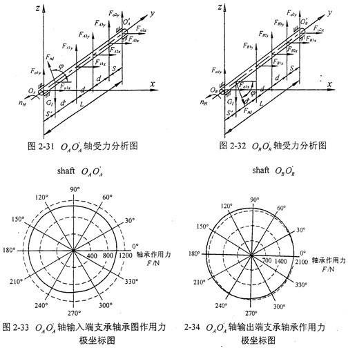 由2.3.3分析可知:當求得環(huán)板上的軸承作用力FAix、FAiy,F(xiàn)Bix、FBiy后,通過輸入軸和支承軸的受力分析,不難求得箱體上各軸承的作用力。兩根一級輸出二級輸入軸的受力分析如圖2-31、2-32所示。