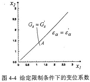 給定初值x1=1.0、x2=2.0,迭代過程及迭代結(jié)果如表4-2所示,給定限制條件下的變位系數(shù)選擇如圖4-4所示,交點(diǎn)A便對應(yīng)著這對齒輪的變位系數(shù)x11.14204,x2=1.40742。