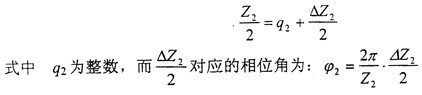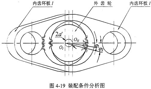 下面來分析它的裝配條件,由于本文提出的新型三環(huán)減速機(jī)環(huán)板相互之間的相位差為180°,所以在分析時(shí),可以只分析兩塊環(huán)板的裝配情況。圖4-19所示為裝配條件分析圖,在兩塊環(huán)板的偏心所構(gòu)成的二角內(nèi),外齒輪1的齒數(shù)為: