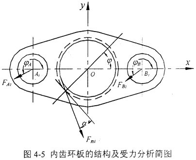 也就是說:當(dāng)一個(gè)內(nèi)齒環(huán)板與外齒輪在某一位置嚙合時(shí),另一塊環(huán)板與外齒輪各自節(jié)圓之對滾弧長差為節(jié)圓齒距,相對相位差角為內(nèi)齒輪一個(gè)齒所對應(yīng)的圓心角,此時(shí)另一塊環(huán)板在該位置剛好能夠裝入。換句話說,對于本文的三環(huán)減速機(jī),按照4.3的制造工藝,就可以將三片內(nèi)齒環(huán)板均布地安裝在兩根高速偏心輸入軸上,并且保證它們之間的瞬時(shí)相位差呈180°角。