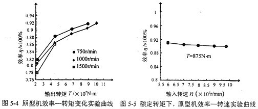 從實驗曲線中可以看出,原型機傳動總效率隨輸出轉(zhuǎn)矩的增加而增加,隨輸入轉(zhuǎn)速的增加而降低。在額定轉(zhuǎn)矩下,傳動總效率隨輸入轉(zhuǎn)速的增加而緩慢降低。測得的原型機最高效率可達92%。