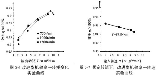 在額定轉(zhuǎn)速和額定轉(zhuǎn)矩范圍內(nèi),改進型機隨著輸出轉(zhuǎn)矩、輸入轉(zhuǎn)速的增加,均載機構(gòu)補償?shù)恼`差增大,均載效果更加明顯,所以改進型機的傳動效率隨輸入轉(zhuǎn)速的增加而增加。綜上所述,三環(huán)減速機的測得效率可達92%以上,因此本實驗從減速機的傳動性能上來講是成功的。
