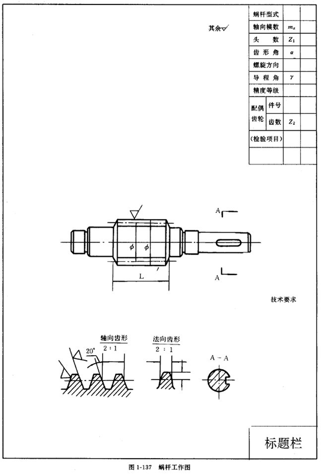 僅列舉出圓柱齒輪(圖1-135)、圓錐齒輪(圖1-136)、蝸桿(圖1-137)和蝸輪(圖1-138)的圖樣格式。