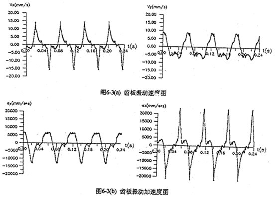 圖6-7是某相雙曲柄機構(gòu)在輸入端具有0.03mm間隙時,齒板及軸承座的振動速度、振動加速度。圖中表明,速度、加速度都在兩個死點位置出現(xiàn)較大的沖擊值。
