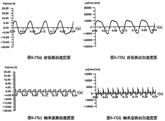 圖6-4是支承軸軸承座及輸出軸軸承座的振動速度及振動加速度時域圖。圖(c)中,一個周期內(nèi)的三根較長的沖擊棒線分別是三相機構(gòu)因死點引起的嚙合沖擊。軸承座的振動速度比齒板的振動速度小,但振動加速度比齒板振動加速芳略大,最大值為