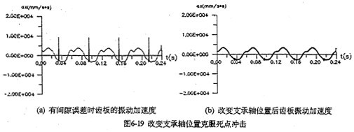 采用雙軸輸人的齒板及箱體軸承座振動速度、加速度如圖6-17所示。從圖看出齒板速度及加速度值明顯變。閱屋S輸人時的0.3倍),而且無沖擊,完全屬于穩(wěn)太振動。箱體的振動速度及加速度幅值只是單軸輸人時的0.2倍。圖6-18a是一軸的偏心套存在0.05度的分度誤差時齒板的加速度曲線圖,圖中明顯出現(xiàn)加速度沖擊棒線。采用雙軸輸入后,死點沖擊被徹底(見圖6-18b) , 變成穩(wěn)態(tài)振動曲線了。因此,為了減小三環(huán)減速器的振動,有必要加大三環(huán)減速器的橫向尺寸,在箱體內(nèi)增加一套雙軸輸入的齒輪功率分流機構(gòu),或者在箱體外另設(shè)計一套功率分流機構(gòu),以解決機構(gòu)過死點的振動問題。