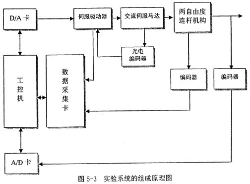 實驗方案以微機控制的交滾伺服電機為原動機之一與控制器、以兩自由度連桿機構為實驗載體,輔以檢測系統(tǒng),建立了一個柔性速度補償裝置控制的實驗系統(tǒng)。