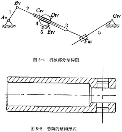 首先將原來的原理圖轉換成以下的機構結構圖(僅部分轉換),如圖5-4,即原來2、3構件之間是滑塊和連桿連接,現(xiàn)改為連桿、套筒改為加一個擺動軸結構,原來滑塊3和地面連接,容易形成過約束,改為加一個擺動軸承4來和地面、套筒來連接。擺動軸承內(nèi)芯相當于一個球副,其轉動中心必為內(nèi)芯的球心,當然也是整個擺動軸承的中心。這樣便于加工查和實驗實施,而且更重要的是可防止原來原理圖中桿件連接出形成過約束。