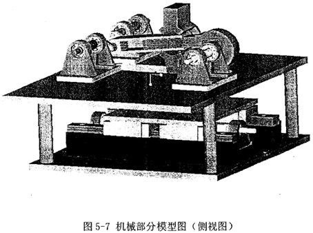 如圖5-1所示為實驗系統(tǒng)機械部分的模型圖片,為了顯示清楚,沒有配置外邊的機箱,整個機構是完全開放式的,這樣也便于實驗觀察。該機械結構由上下兩個機架支撐,和前面的原理圖不同,下邊機架上放置昆旋導軌構件(未顯示伺服電機),上邊機架則是上圖所示的其余連桿機構及其支撐架、軸承等(未顯示常速電機)。