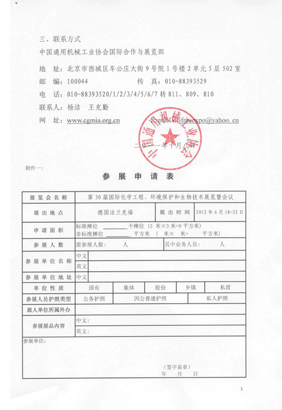 參展方式:預(yù)參展會(huì)員企業(yè)于2011年10月31日前向各專業(yè)分會(huì)報(bào)名并說(shuō)明參展面積;總會(huì)統(tǒng)計(jì)參展商人數(shù)及參展面積后,向阿赫瑪展會(huì)主辦方申請(qǐng)參展總面積,待主辦方確認(rèn)面積及價(jià)格后,向各參展商通報(bào)最終展位價(jià)格并與之共同協(xié)商展位分布!秴⒄股暾(qǐng)表》見附件一。
