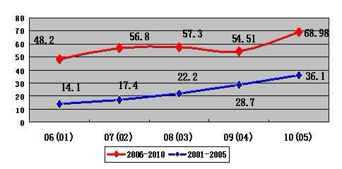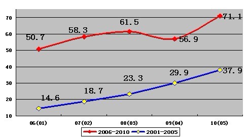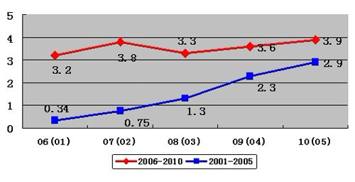 2006年至20010年雖然總量有較大的增長,但增長速度趨緩。
