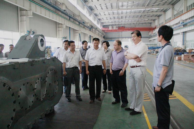 中傳重裝總經(jīng)理李圣強(右三)陪同神華神東董事長張子飛(右二)一行參觀中傳重裝大采高全直齒傳動搖臂裝配現(xiàn)場