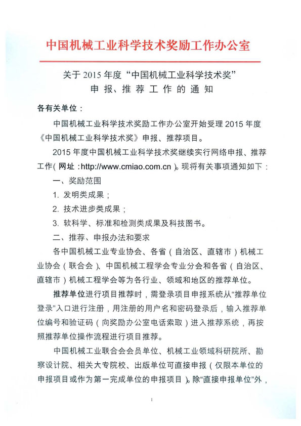您現(xiàn)在的位置是:減速機首頁>>新聞資訊>>行業(yè)資訊>>關(guān)于2015年度“中國機械工業(yè)科學(xué)技術(shù)獎”申報、推薦工作的通知