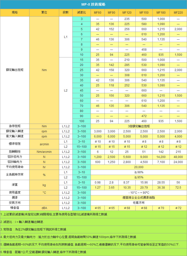 四.MF-X系列具體型號:MF60XL1,MF60XL2,MF60XL3(減速機數比3~100)MF90XL1,MF90XL2,MF90XL3(減速機數比3~1000)MF120XL1,MF120XL2,MF120XL3(減速機數比3~1000)MF150XL1,MF150XL2,MF150XL3(減速機數比3~1000)MF180XL1,MF180XL2(減速機數比3~1000)