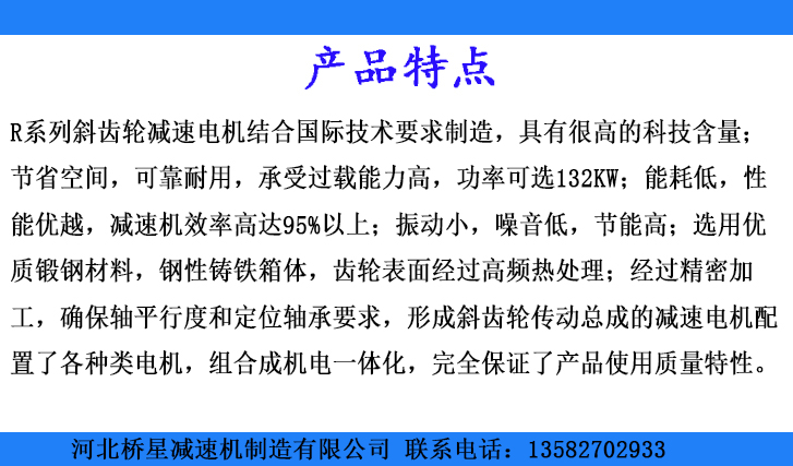 1、R系列斜齒輪減速電機(jī)結(jié)合國際技術(shù)要求制造,具有很高的科技含量