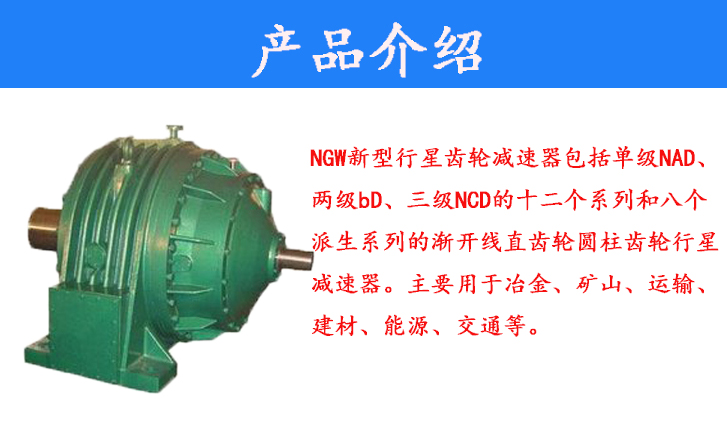 NGW新型行星齒輪減速器包括單級(jí)NAD、兩級(jí)NBD、三級(jí)NCD的十二個(gè)系列和八個(gè)派生系列的漸開線直齒輪圓柱齒輪行星減速器。主要用于冶金、礦山、運(yùn)輸、建材、能源、交通等。
