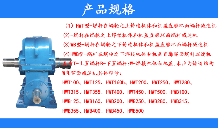 (4)HWB型-蝸桿在蝸輪之下焊接機(jī)體和機(jī)蓋直廓環(huán)面蝸桿減速機(jī)其中T-上置蝸桿B-下置蝸桿:W-焊接機(jī)體和機(jī)蓋,未注為鑄造結(jié)構(gòu)W直環(huán)面減速機(jī)具體型號(hào):HWT100、HWT125、HWT160、HTW200、HWT250、HWT280、HWT255、HWB400、HWB450、HWB500