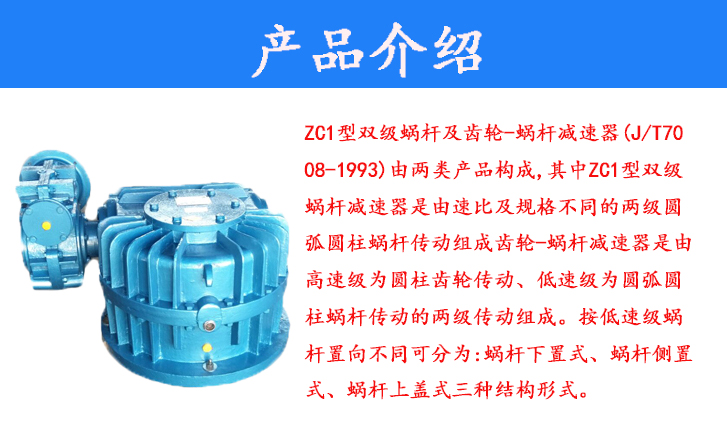 ZC1型雙級(jí)蝸桿及齒輪-蝸桿減速器(J/T7008-1993)由兩類產(chǎn)品構(gòu)成,其中ZC1型雙級(jí)蝸桿減速器是由速比及規(guī)格不同的兩級(jí)圓弧圓柱蝸桿傳動(dòng)組成齒輪-蝸桿減速器是由高速級(jí)為圓柱齒輪傳動(dòng)、低速級(jí)為圓弧圓柱蝸桿傳動(dòng)的兩級(jí)傳動(dòng)組成。按低速級(jí)蝸桿置向不同可分為:蝸桿下置式、蝸桿側(cè)置式、蝸桿上蓋式三種結(jié)構(gòu)形式。