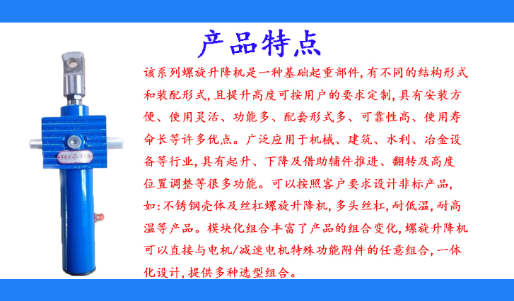 該系列螺旋升降機(jī)是一種基礎(chǔ)起重部件,有不同的結(jié)構(gòu)形式和裝配形式,且提升高度可按用戶的要求定制,具有安裝方便、使用靈活、功能多、配套形式多、可靠性高、使用壽命長(zhǎng)等許多優(yōu)點(diǎn)。廣泛應(yīng)用于機(jī)械、建筑、水利、冶金設(shè)備等行業(yè),具有起升、下降及借助輔件推進(jìn)、翻轉(zhuǎn)及高度位置調(diào)整等很多功能?梢园凑湛蛻粢笤O(shè)計(jì)非標(biāo)產(chǎn)品,如:不銹鋼殼體及絲杠螺旋升降機(jī),多頭絲杠,耐低溫,耐高溫等產(chǎn)品。模塊化組合豐富了產(chǎn)品的組合變化,螺旋升降機(jī)可以直接與電機(jī)/減速電機(jī)特殊功能附件的任意組合,一體化設(shè)計(jì),提供多種選型組合