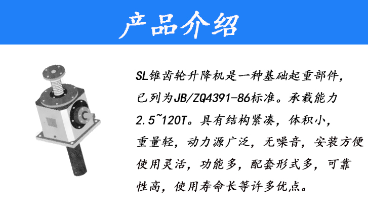 SL錐齒輪升降機(jī)是一種基礎(chǔ)起重部件,已列為JBZQ4391-86標(biāo)準(zhǔn)。承載能力2.5~120T。具有結(jié)構(gòu)緊湊、體積小、重量輕、動(dòng)力源廣泛、無噪音、安裝方便、使用靈活、功能多、配套形式多,可靠性高、使用壽命長等許多優(yōu)點(diǎn)。