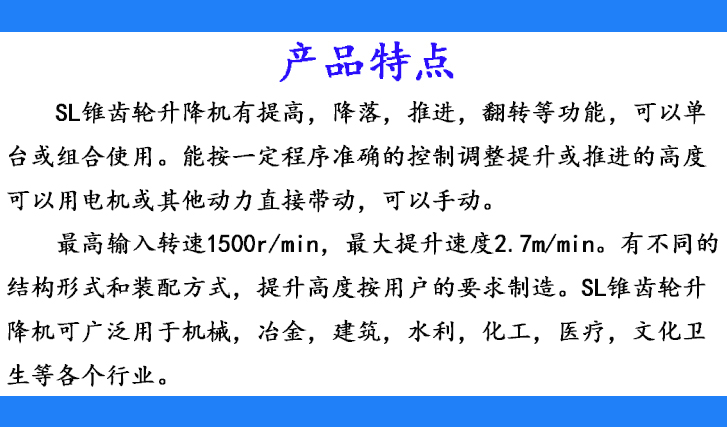 SL錐齒輪升降機(jī)可廣泛用于機(jī)械、冶金、建筑、水利、化工、醫(yī)療文化衛(wèi)生等各個(gè)行業(yè)。