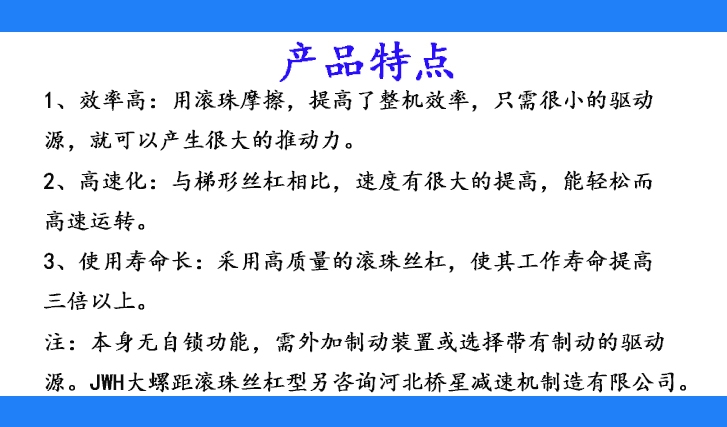 3、使用壽命長:采用高質(zhì)量的滾珠絲杠,使其工作壽命提高3倍以上