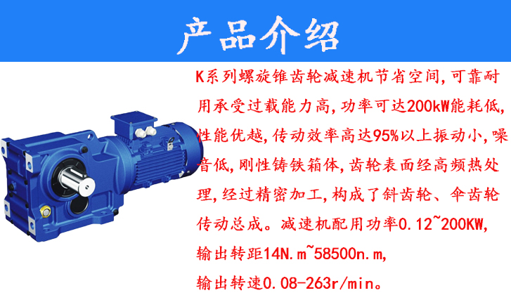 K系列螺旋錐齒輪減速機(jī)節(jié)省空間,可靠耐用承受過載能力高,功率可達(dá)200kW能耗低,性能優(yōu)越,傳動(dòng)效率高達(dá)95%以上振動(dòng)小,噪音低,剛性鑄鐵箱體,齒輪表面經(jīng)高頻熱處理,經(jīng)過精密加工,構(gòu)成了斜齒輪、傘齒輪傳動(dòng)總成。減速機(jī)配用功率0.12~200KW,輸出轉(zhuǎn)距14N.m~58500n.m,輸出轉(zhuǎn)速0.08-263r/min
