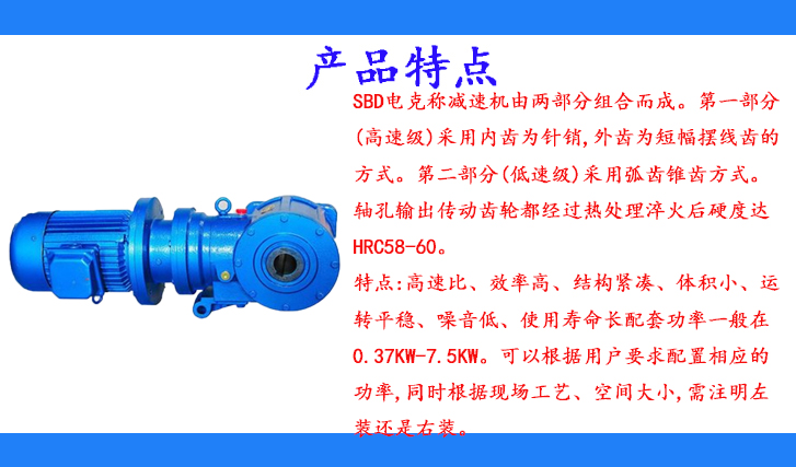 SBD電克稱減速機(jī)由兩部分組合而成。第一部分(高速級(jí))采用內(nèi)齒為針?shù)N,外齒為短幅擺線齒的方式。第二部分(低速級(jí))采用弧齒錐齒方式。軸孔輸出傳動(dòng)齒輪都經(jīng)過(guò)熱處理淬火后硬度達(dá)HRC58-60。