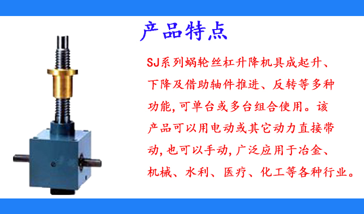 SJ系列蝸輪絲杠升降機(jī)具成起升、下降及借助軸件推進(jìn)、反轉(zhuǎn)等多種功能,可單臺(tái)或多臺(tái)組合使用。該產(chǎn)品可以用電動(dòng)或其它動(dòng)力直接帶動(dòng),也可以手動(dòng),廣泛應(yīng)用于冶金、機(jī)械、水利、醫(yī)療、化工等各種行業(yè)。