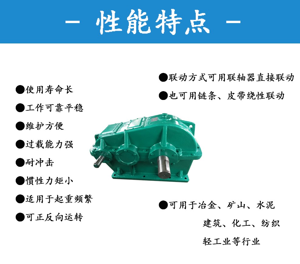 該系列齒輪減速機(jī)使用壽命長,工作可靠,維護(hù)方便。本機(jī)還具有過載能力強(qiáng),耐沖擊、慣性力矩小,適用于起重頻繁和正、反向運(yùn)轉(zhuǎn)的特點。其聯(lián)動方式可用聯(lián)軸器直接聯(lián)動,也可用鏈條、皮帶撓性聯(lián)動主要用于冶金、礦山、水泥、建筑、化工、紡織、輕工業(yè)等行業(yè)。