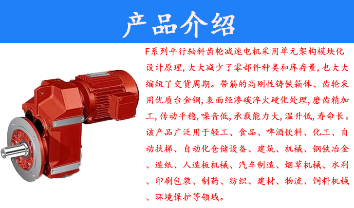 F系列平行軸斜齒輪減速電機采用單元架構模塊化設計原理,大大減少了零部件種類和庫存量,也大大縮短了交貨周期。帶筋的高剛性鑄鐵箱體、齒輪采用優(yōu)質臺金鋼,表面經(jīng)滲碳淬火硬化處理,磨齒精加工,傳動平穩(wěn),噪音低,承載能力大,溫升低,壽命長。該產(chǎn)品廣泛用于輕工、食品、啤酒飲料、化工、自動扶梯、自動化倉儲設備、建筑、機械、鋼鐵冶金、造紙、人造板機械、汽車制造、煙草機械、水利、印刷包裝、制藥、紡織、建材、物流、飼料機械、環(huán)境保護等領域。