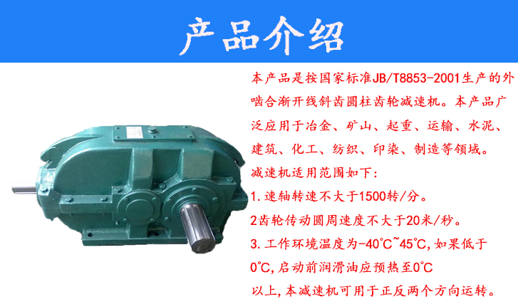 本產(chǎn)品是按國家標(biāo)準(zhǔn)JB/T8853-2001生產(chǎn)的外嚙合漸開線斜齒圓柱齒輪減速機(jī)。