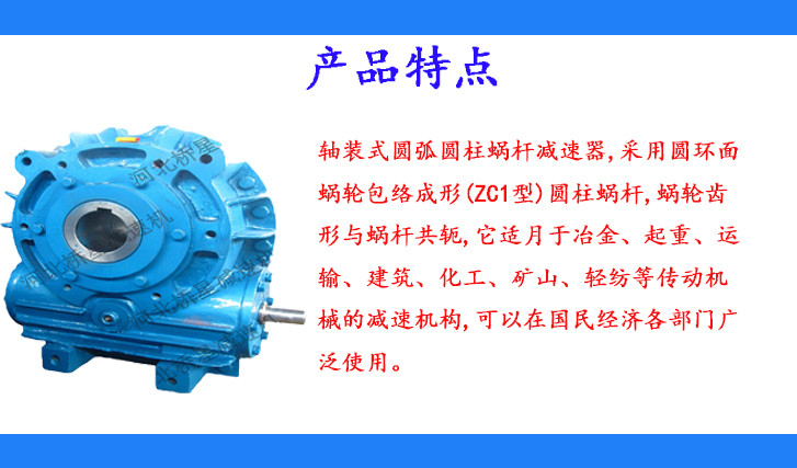 軸裝式圓弧圓柱蝸桿減速器,采用圓環(huán)面蝸輪包絡(luò)成形(ZC1型)圓柱蝸桿,蝸輪齒形與蝸桿共軛,它適月于冶金、起重、運(yùn)輸、建筑、化工、礦山、輕紡等傳動(dòng)機(jī)械的減速機(jī)構(gòu),可以在國民經(jīng)濟(jì)各部門廣泛使用。