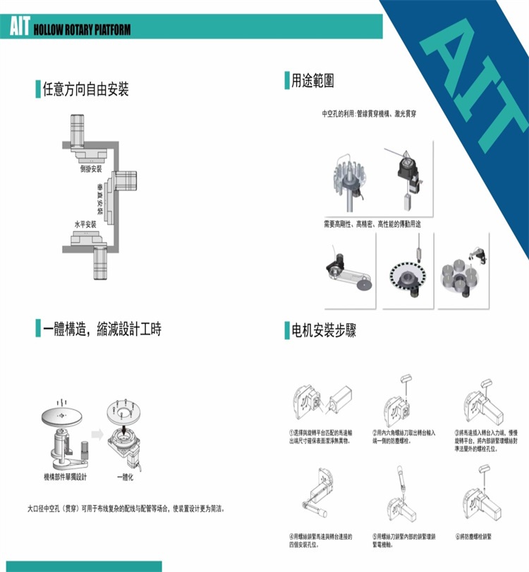 使用高剛性的交叉斜角滾子軸承與旋轉(zhuǎn)平臺(tái)面呈現(xiàn)一體化的設(shè)計(jì),可承受大慣性的圓盤裝置,整組搭配步進(jìn)馬達(dá)及驅(qū)動(dòng)器。