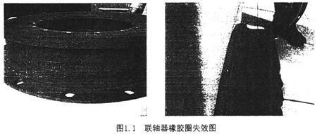 彈性聯(lián)軸器是應(yīng)用廣泛的機械零部件,在工業(yè)生產(chǎn),石油,化工,冶金等工業(yè)部門都有應(yīng)用,彈性聯(lián)軸器的使用狀況直接關(guān)系到機械設(shè)備的安全及壽命問題,尤其是一些重要場合,彈性聯(lián)軸器的失效問題往往引起人們的極大關(guān)注,例如某公司的GKZ型內(nèi)燃機車采用MTU16V396TC14型柴油機做內(nèi)燃機。MTU柴油機與風扇偶合器采用萬向軸來傳遞動力。為了緩和沖擊力,柴油機輸出軸與萬向軸聯(lián)接采用彈性聯(lián)軸器。0002#機車使用7年后,彈性聯(lián)軸器被剪斷,剪斷后的聯(lián)軸器如圖1.1所示。更換同種型號的彈性聯(lián)軸器后,使用未到一年又被剪斷,而同一型號的0001#,0003#機車使用時間以達9年,但彈性聯(lián)軸器依然完好如初。