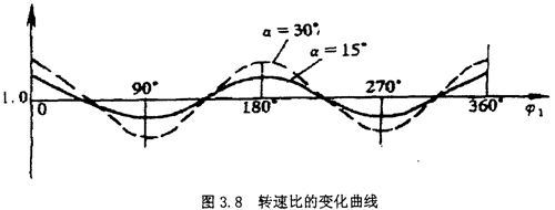 當(dāng)主動轉(zhuǎn)子的回轉(zhuǎn)角速度為常數(shù)時,從動轉(zhuǎn)子的角速度是偏角和主動轉(zhuǎn)子轉(zhuǎn)角的函數(shù)。當(dāng)或ф1=00或1800時,ω2最大,當(dāng)ф2=900獲2700時,ω2最小。其轉(zhuǎn)速比變化曲線如圖3.8所示,即有ω1cosa≤ω2≤