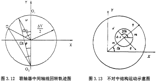 工作狀態(tài)下聯(lián)軸器的動態(tài)特性如圖3.13所示,兩半聯(lián)軸器的中心為O1和O2,聯(lián)軸器外殼的動態(tài)中心為O′,當(dāng)系統(tǒng)以Ω轉(zhuǎn)動時,外殼重心的加速度在