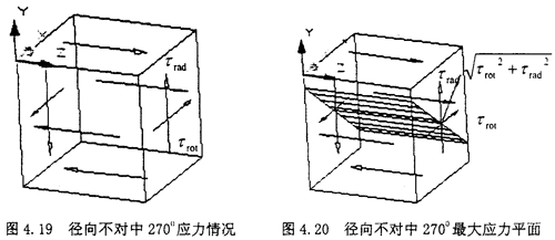 由圖示可知,此時單元體的受力其實是屬于純剪切狀態(tài),只是此時的剪切應力為τrad與τrot的疊加。其分析過程與徑向不對中1800時的情況相似,只是這時τrad與τrot的方向相同,而在1800時方向相反,所以有